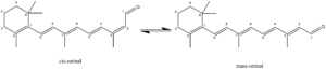 Men hvordan er det vi ser lys? Vi bruker rhodopsiner som binder retinal. Den energien som fotonet bærer med seg virker uendelig smått: 3.89499e-19 J Men det er nok til å få cis-retinal til å gå over til trans-retinal.